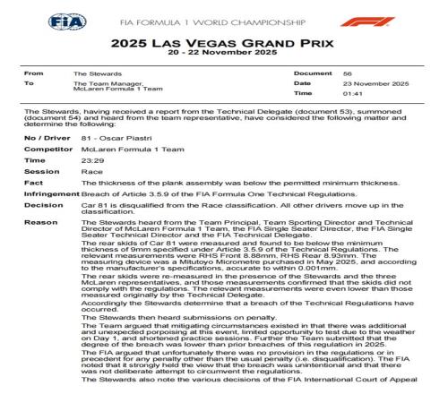 2025賽季F1拉斯維加斯大獎賽正賽剛剛結束,麥克拉倫便遭遇晴天霹靂!國際汽聯賽后發布公告稱,由于諾里斯和皮亞斯特里的賽車底板磨損測量厚度未達到技術規則要求的最小厚度(9毫米),因此二者均被取消拉斯維加斯站正賽的比賽成績。