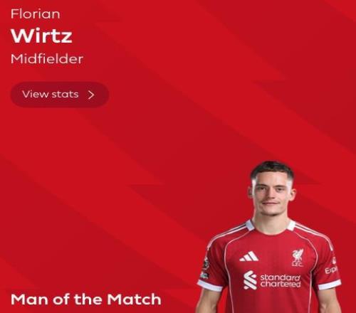 英超第14輪,利物浦主場1-1戰(zhàn)平桑德蘭,維爾茨當(dāng)選英超官方全場最佳球員。